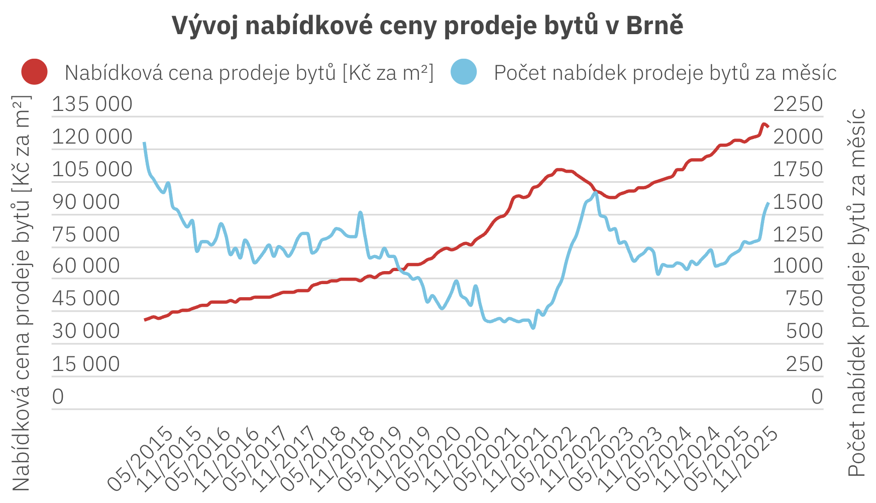 Níže uvedený graf ilustruje dlouhodobý růst cen nabízených nemovitostí k prodeji v Brně, který patří k nejstabilnějším a zároveň nejrychlejším v ČR.